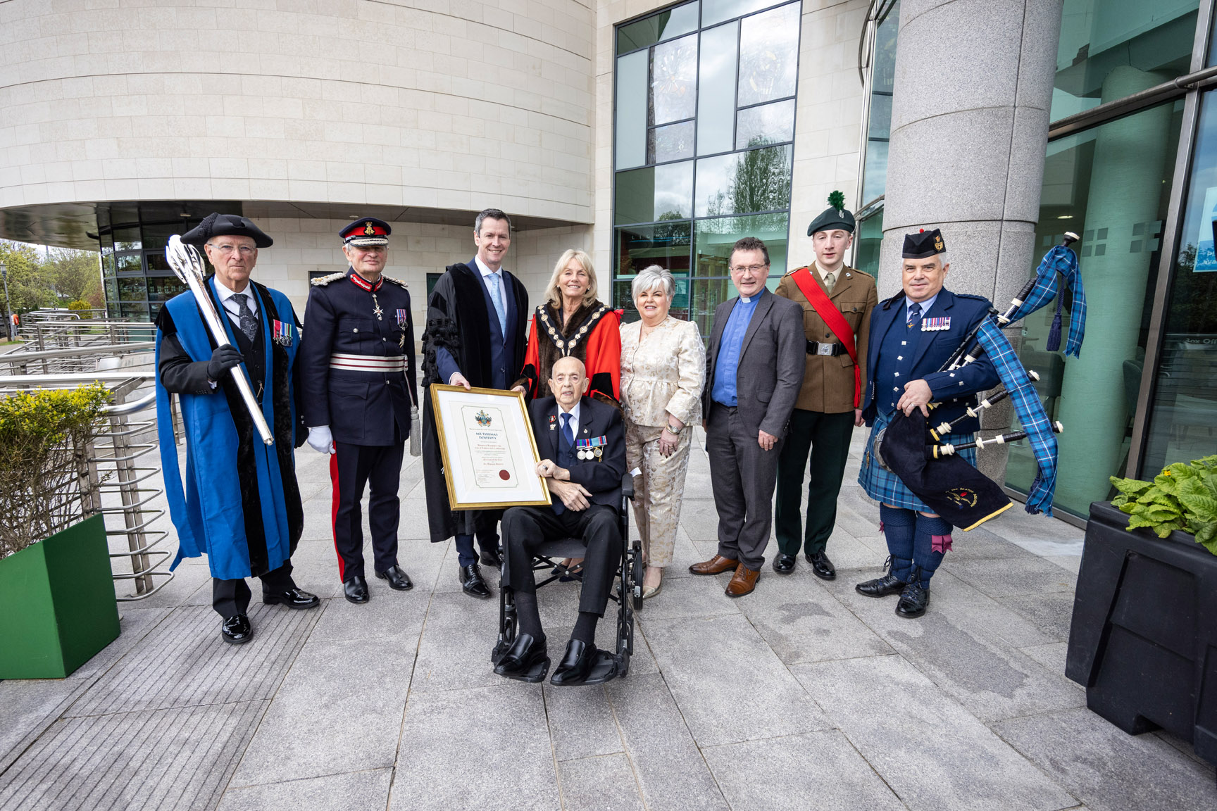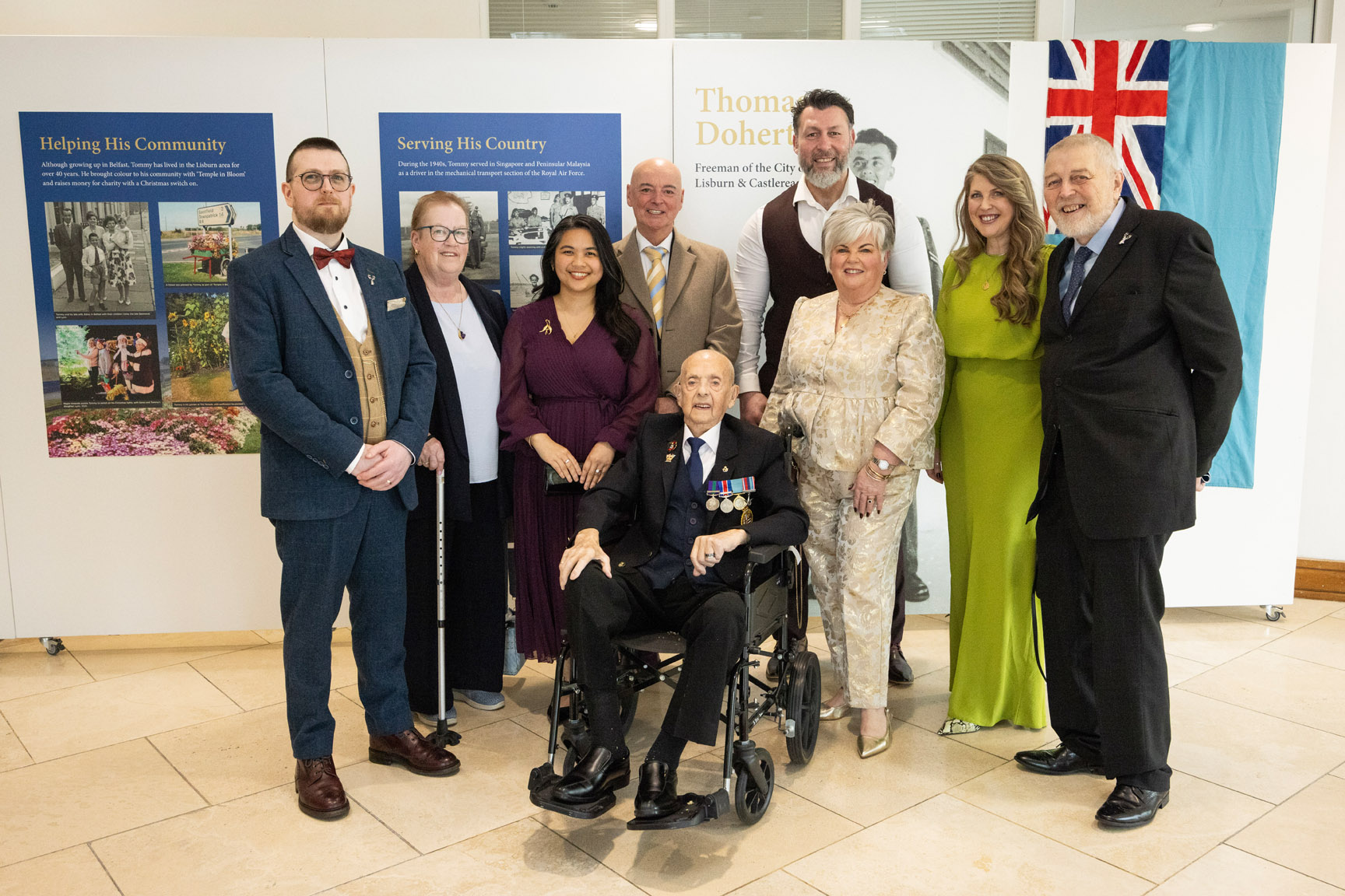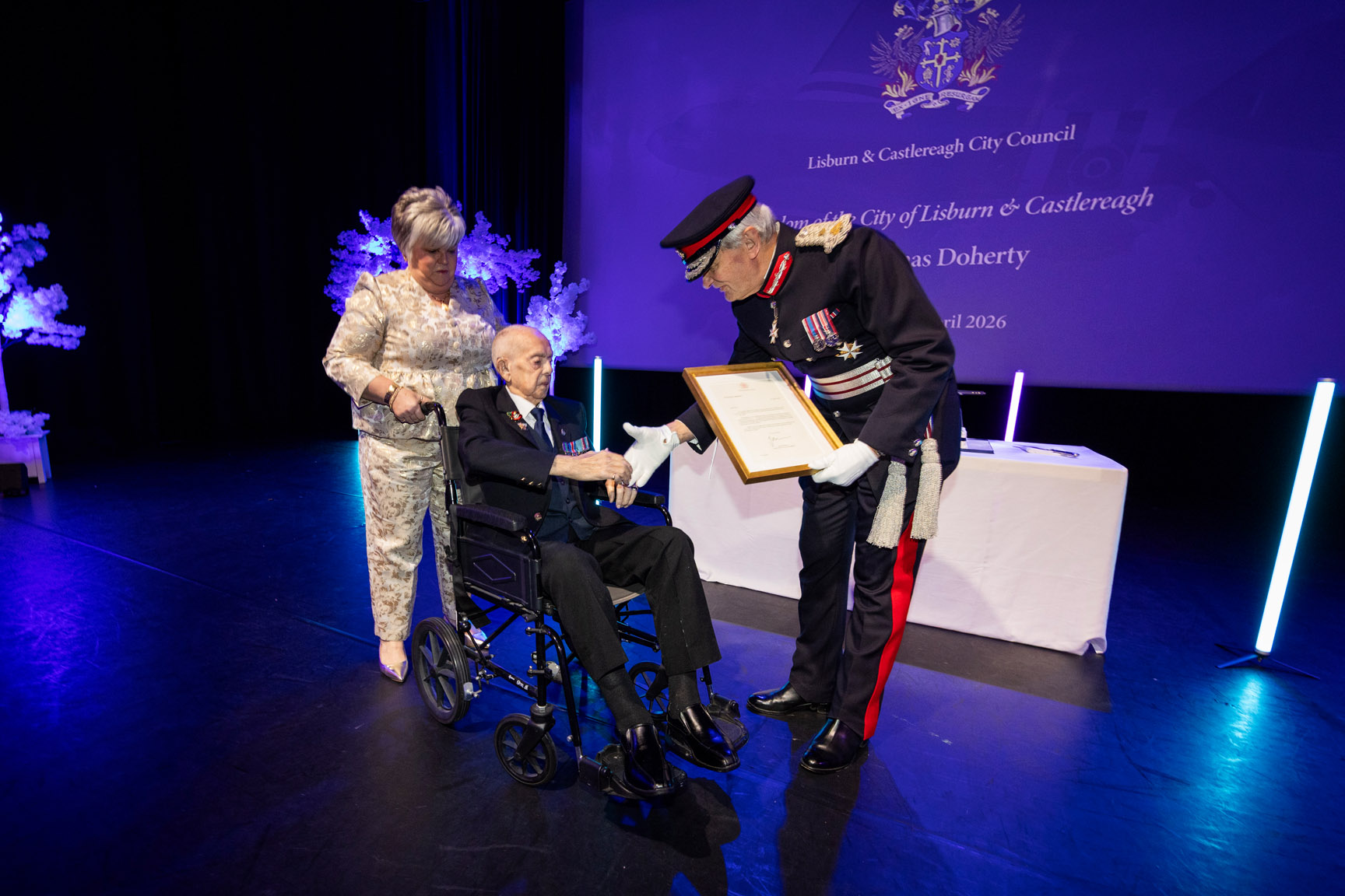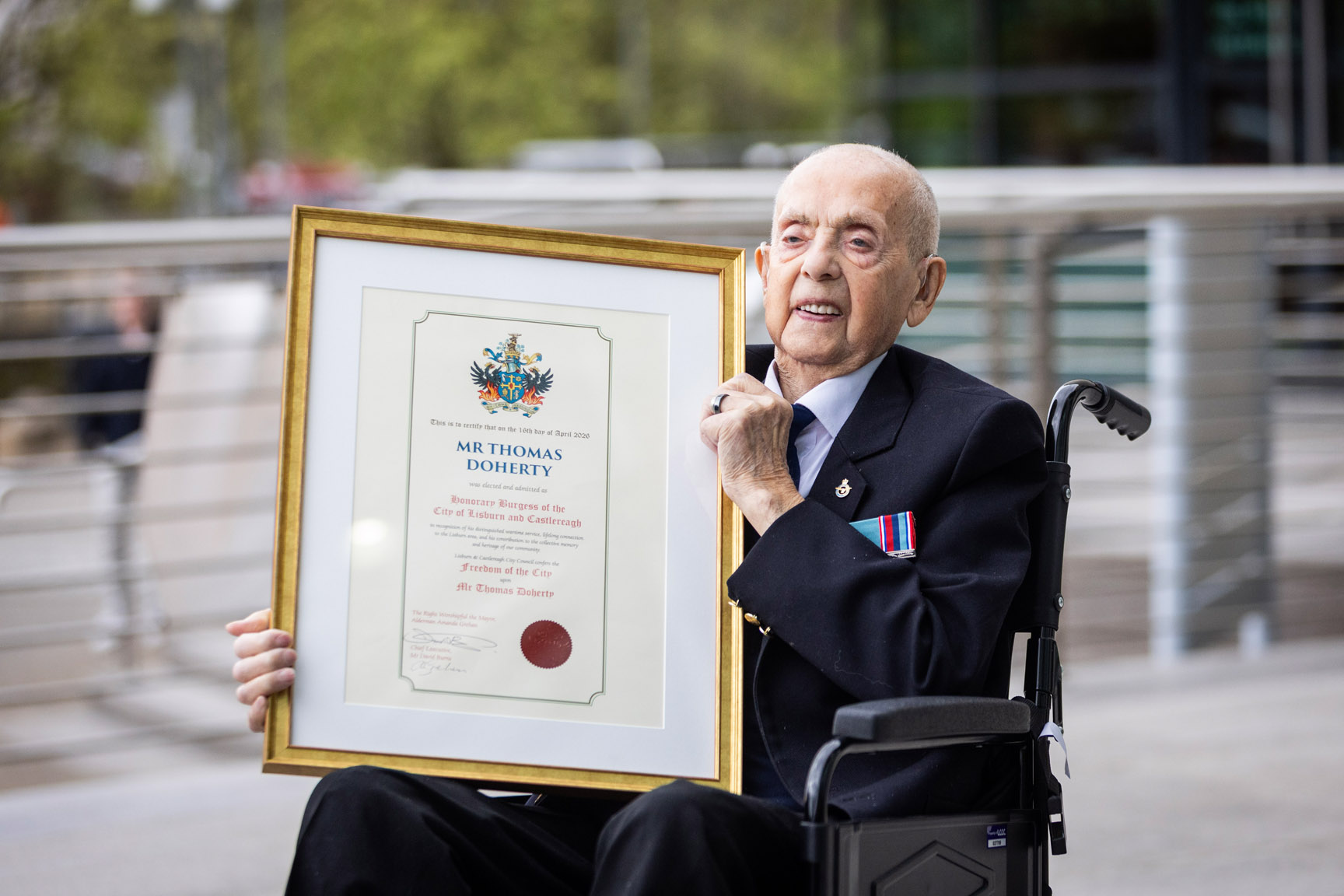 “It is a true privilege to honour Mr Thomas Doherty with the Freedom of the City. Tommy’s life is one of extraordinary service, resilience and generosity. From his contribution during wartime, to his unwavering support for veterans and his continued dedication to his local community, he represents the very best of Lisburn and Castlereagh.